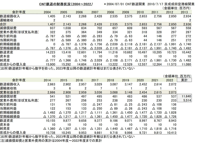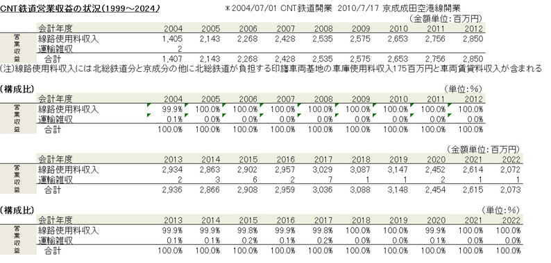 CNT鉄道は2010年に成田空港線が開業した年に黒字に転換しました。しかし、その後コロナ前の2017年度に赤字に転落し、線路使用料契約が変更された2022年度に黒字に転換しています。線路を保有しているだけの第三種鉄道事業者の業績が、通常大きくブレることは考えにくと思います。