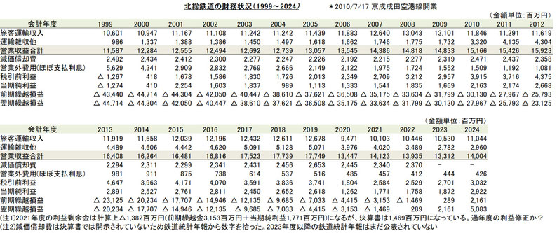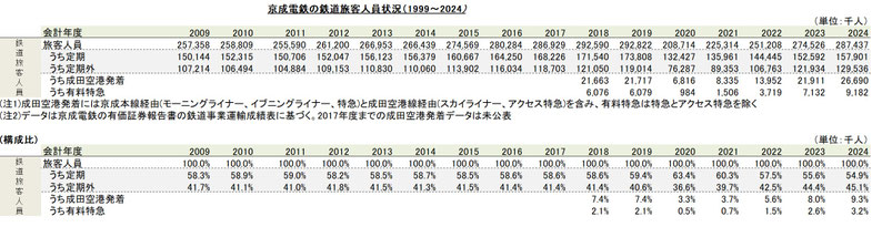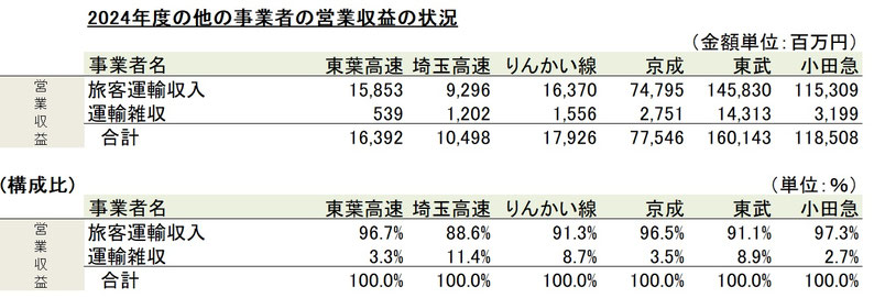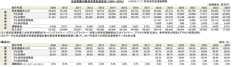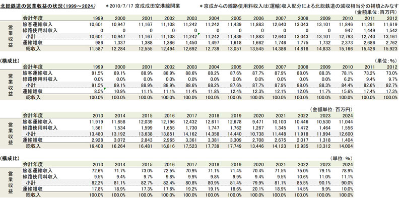2024年度の旅客運輸収入は110億円で成田空港線開業前の2009年度の131億円に届いていません。これは成田空港線開業後に始まった運輸収入の収入配分によるものですが、減収分を補填するための線路使用料を合計した金額も126億円余りで成田空港線開業前の額に届いていません。
