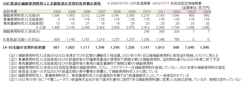 一見、線路使用料が大幅に引き下げられたように見えますが、CNT鉄道が北総線に支払っていた負担金と相殺しただけで北総鉄道の実質的な線路使用料の負担額は変わっていません。CNT区間の運輸収入が増えれば北総鉄道の収入が増えるかもしれませんが、これまでCNT区間の運輸収入全額を線路使用料として払わされてきたのですから当然のことです。