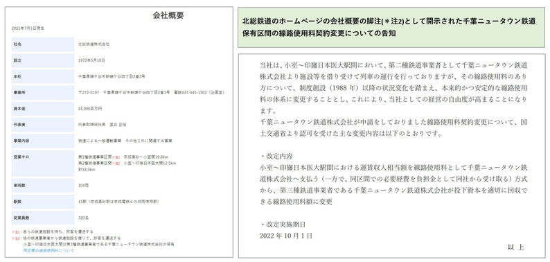 北総鉄道の決算公告には、2社の関係が親会社と兄弟会社と説明されています。しかし、CNT鉄道は法人登記はされていますが、架空の会社とも言えます。線路使用料の取引条件は各社と協議の上決定していると書かれています。